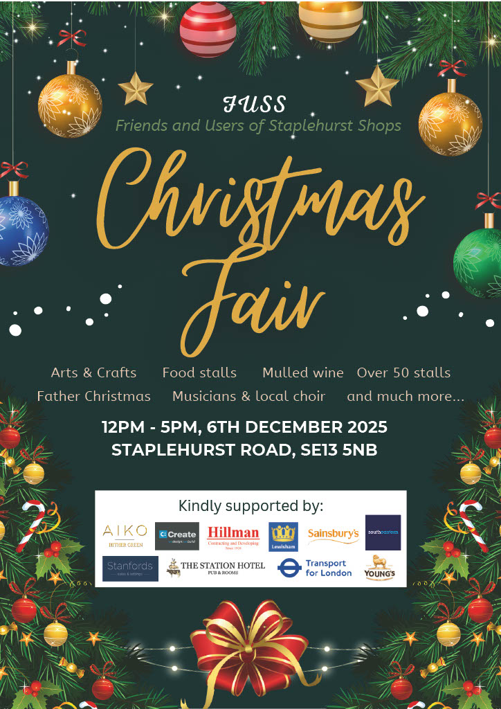 The FUSS Christmas Fair at Hither Green will be on Saturday 6th December, noon to 5pm. The organisers promise more than 50 stalls, food and drink, live music and Father Christmas. It all happens around Staplehurst Road near the station.