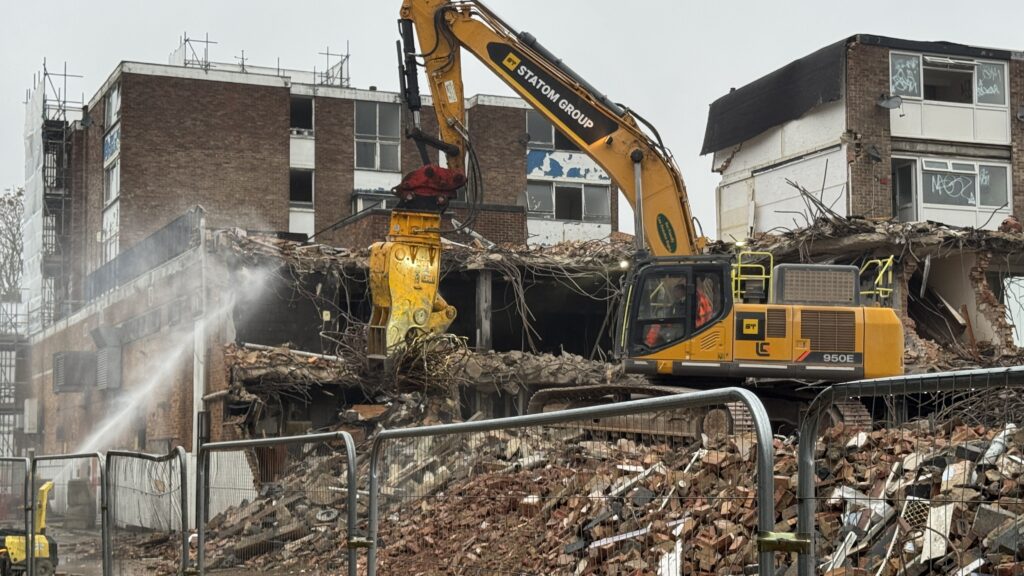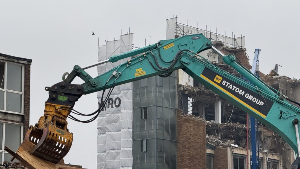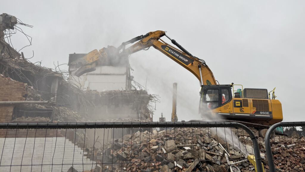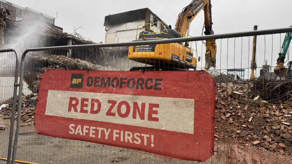 High powered water hoses are playing constantly on the rubbles to suppress the dust. Once complete, the rubble will be crushed to be used as part of the foundations of the new development.