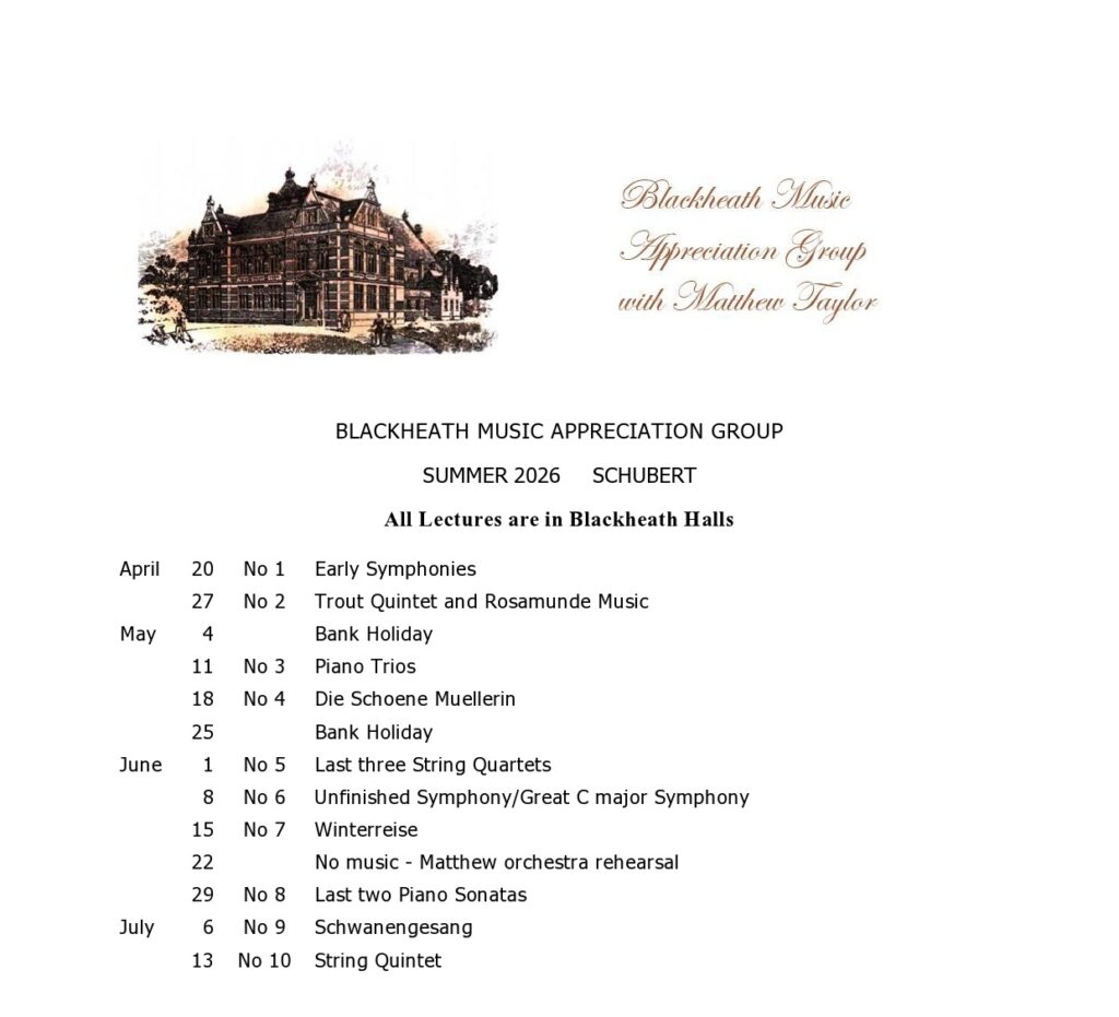 The Blackheath Music Appreciation Group tells us it is starting as series of summer term lectures on the music of Franz Schubert.