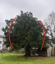 ONE Yew tree (T2) LHB CROWN REDUCTION ht by 1m from 15m to 14m spread by 1m from 5m to 4m.
